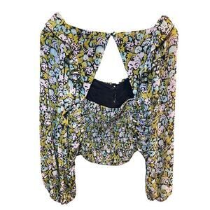 Free People Medium Mabel Balloon Sleeve Ruched Cropped Top Peasant Blouse Floral