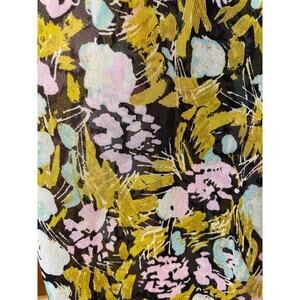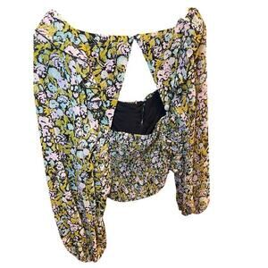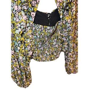 Free People Women's size Medium Mabel Balloon Sleeve Ruched Cropped Top Peasant Blouse Floral pattern. This top is in beautiful preloved condition. No call outs. Colors include Black, light pink, light blue, green/yellow color. Ruffles on the sleeves and neckline. All in a gorgeous boho chic floral pattern. Peasant tie in the front that goes down into a shallow V cut that laces up like a corset in the front. Smocked elastic back with a ruched front waist.