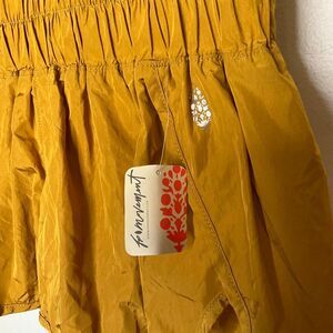 lightweight running shorts in a bright orange color, designed with a high-rise smocked waistband, a relaxed fit, and a 2-inch inseam for comfort and performance during exercise and daily activities. These shorts are made from materials like nylon or polyamide.