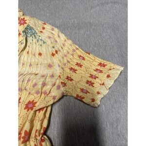The Free People Rare Feeling Maxi Dress in size Small is a vibrant yellow floral dress that exudes a boho, western vibe. With its short flared sleeves and V-neckline, this dress is perfect for casual or travel occasions during the summer, fall, or spring seasons. Made from a blend of viscose and cotton, this lightweight and lined dress features pleated accents, tasseled details, and a button closure, adding a touch of whimsy to the overall look. Perfect for those who love the flowery theme and appreciate the brand's unique style and quality.