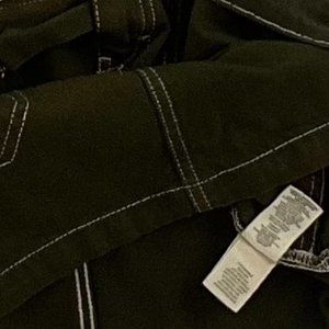 Free People Canteen Green Utility Mini Skirt with Front and Back Pockets and Self tie belt, front zip fly, Raw edge inner waistband. 80% Cotton/20% Lyocell