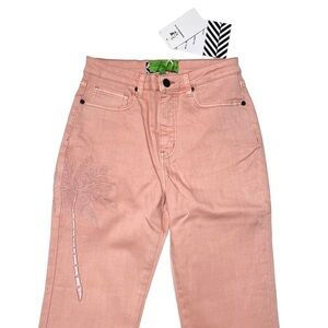 Free People X Sandrine Rose Pink Palm Tree Embroidered Skinny Jeans / has stretch / High Waisted / size 25 / Flat Lay measurements: Waist: 12 1/2” Rise: 10” Inseam: 27”