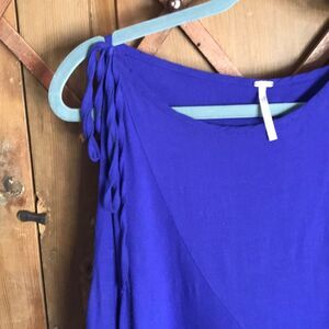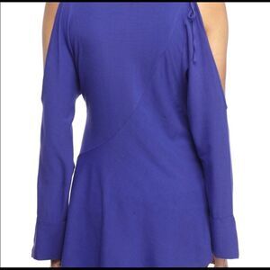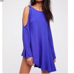 Free People purple cold shoulder tunic dress with tie strap on one shoulder and long sleeves with slit on cuff. Asymmetrical hem. EUC