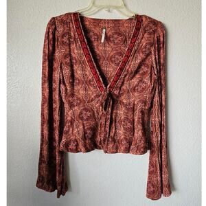 Free People FP bell sleeve Kaleidoscope blouse snap front with fabric ties, beautiful boho style works with jeans or a skirt, puff sleeve, V plunge neckline, can open fully in front, women’s size xs extra small in excellent condition.