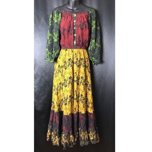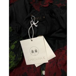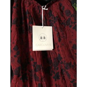 Beautiful tiered midi dress from Carolina K featured in a mixed printed style with a button-up front and ruffled sleeves that can be worn on or off the shoulder.