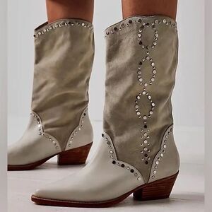 Features: Pull-on style, Western design, leather and suede uppers, pointed toe, studded design, slight block heel