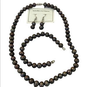 Freshwater Pearl Set (3 Pcs). Gray/Peacock color. Brand New. Silvertone closures. Each pearls have different sizes but they are approx 10mm each. Timeless jewelry for sure😊
