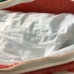 Coral print lumbar pillow with solid coral colored back. Has zipper closure. In VGUC