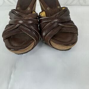 Frye Brown Leather Reese Multi Slide Heels 7.5 Stacked Cone Heel Slip On Sandals
