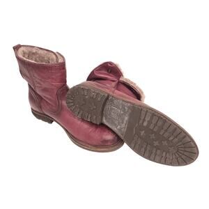 Women’s FRYE 'MARA' Shearling Lined Short 76747 Boot Bordeaux Oxblood Button. Size 8.5 B, medium US. Rubber soles. Leather and shearling uppers.
