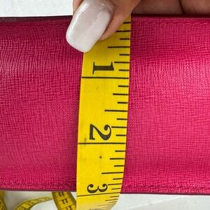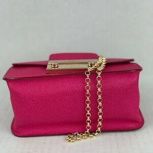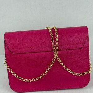 This Furla crossbody bag in a striking pink hue is a perfect blend of elegance and functionality. Featuring a gold chain strap and a secure flap closure, it offers a sophisticated look for both casual outings and evening events. The saffiano-style texture adds a touch of luxury to its minimalist design this bag is in good condition a new unbranded shoulder strap is provided since the original was miss placed other than that beautiful bag.