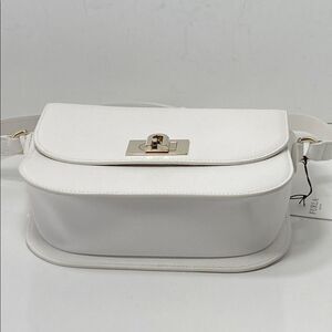 In a structured silhouette, this luxe leather bag has an adjustable shoulder strap and polished goldtone hardware.