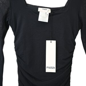FUZZI RUCHED BODYCON DRESS SIZE M MEDIUM BLACK LONG SLEEVE SQUARE NECK MESH