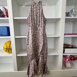 A neutral hue milds the wild of this leopard print dress, cut from supple satin, finished with a ruffle-decked hemline and ready for party season. Halter neck. Sleeveless, with cutaway shoulders. Front slit. Back slit. Lined. Approx. 36" front length; 48" back length (size 0). 100% viscose. Good American size 2 equivalent to a size medium