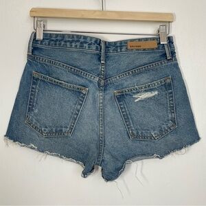 GRLFRND's high-rise Cindy denim cutoff shorts in Psychedellic Shack are crafted of medium blue, non-stretchy, cotton denim that is distressed with light fading and distressing. Featuring whiskering at hips, fraying at hems, and rip details. Five pocket style with logo patch at back waist.