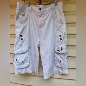 GS115 Jeans white knee length shorts, front zipper, pockets, snaps, flaps, 36