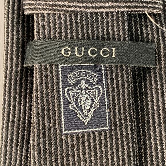 GUCCI necktie in a black and grey silk featuring a stripe pattern. Comes with box. Made in Italy.