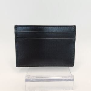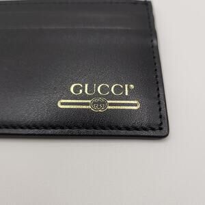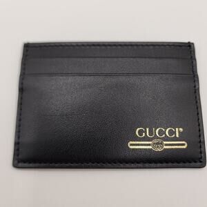 BLACK LEATHER CARD CASE WITH GUCCI SCRIPT IN GOLD. TAFFETA LINING. GUCCI SCRIPT DETAIL. FOUR CARD SLOTS, ONE OPEN POCKET. 4" W X 2.5 H. MADE IN ITALY