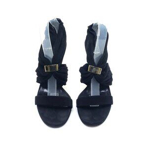 GUCCI High Heel Sandals Black Suede Strap Gold Logo Zip EU 39.5 US 9.5