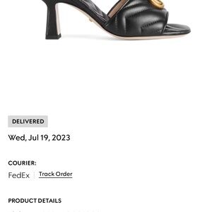 Gucci women’s double G slide leather sandal with gold emblem. Authentic shoe never worn with receipt shown; both shoe has sleeves included.