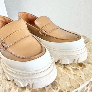 Stylish and comfortable women's loafers in tan and white. Perfect for any occasion.