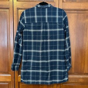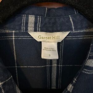 EUC long sleeve button front shirt from Garnet Hill in a size Small. This top is a beautiful navy blue plaid pattern and is 100% cotton. Slightly longer length. No stains or flaws!