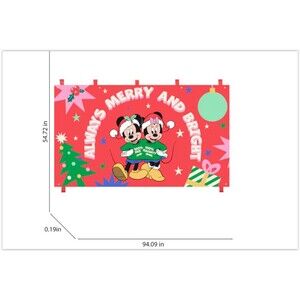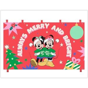 Perfect for creating an eye-catching focal point or photo op, this Disney banner features Mickey and Minnie in "naughty" and "nice" sweatshirts, along with an "Always Merry and Bright" sentiment. Includes built-in loops for hanging.