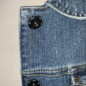 Beautiful Gently Loved Denim Jacket by Brighton, with Beautiful Sparkly Snap Buttons.. Beautiful Details, Sleeves Are Flared.. Found No Stains .. Only Flaw I See Is on Botton Right Inside Corner.. (see photo) I Could Not Find The Size In This, Believe Its Rubbed off, If I Remember Correctly When I Purchased Its a Large .. Will Post Measurements!