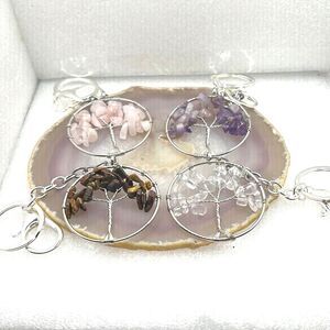 Genuine Gemstone Tree of Life Purse Charm Keychain. All are new! This listing is for your choice of one. Available in Rose Quartz, Clear Quartz, Golden Tiger Eye or Amethyst. Silver toned metal. See picture for measurement.