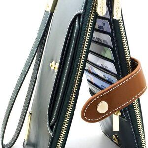 Features: Elegant genuine oil-waxed cowhide with a vintage vibe, designed bigger to fit larger phones. Comes with a handy detachable wrist strap for easy carrying. Equipped with RFID secure technology to keep your card info safe from unauthorized scans. Large capacity with 17 card slots, 2 ID windows, a coin zipper pocket, and extra zipper compartments—perfect for organizing your cash, cards, IDs, and receipts. Stylish and durable, this wallet ages beautifully, looking shinier with use.