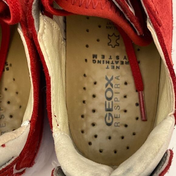 Our Respire Men's Perforated Suede Lace-up Sneakers In Red Size 8 are the perfect blend of style and comfort. The breathable Geox sole technology ensures your feet stay fresh, while the red suede upper adds a touch of sophistication. With a lace-up design and a comfortable fit, these sneakers will take you from morning jogs to casual outings with ease.