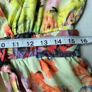 Nwt Gianni Bini Erynn Romper. In the garden Foam bouquet. Color is mostly a light green with multi color flowers. V neck with a Hidden snap button, elbow length sleeves that have a sleeve table and elastic waist band that has a waist tie that can be removed. Fully lined. Polyester spandex blend