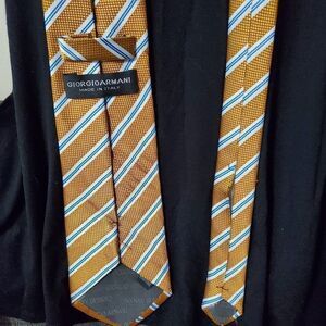 Giorgio Armani orange, white, and blue striped hand made in Italy silk tie.