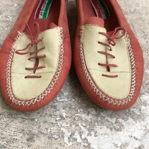 These Flats are salmon colored with a contrast of cream. Styled in Italy and as you see from the pictures they are in good condition. they’re also very comfortable Don’t Know why it looks like yellow in the pictures it’s not.