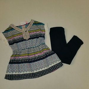 Short-sleeves with fringe trim, v-neckline with embroidered accent, cinched elastic waist top with elastic waistband, pull-on style, stretch fit, solid navy leggings. Pet and smoke free environment.