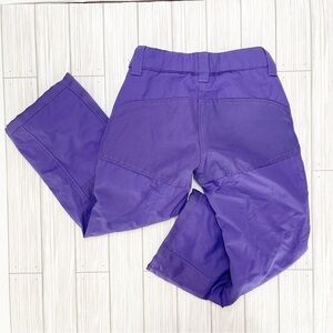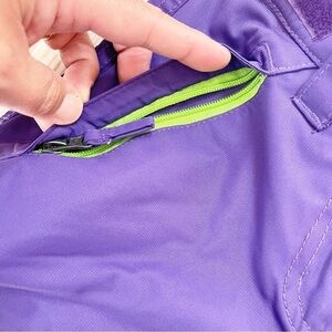 GUC Girl's Zermatt Snow Pants. Purple and neon green and size Small. Great used condition, some small loose threading the right knee and the velcro has come loose next to the snap buttons, but is easily fixed (see pictures). Warm and has elastic with rubber grip around the ankles. Also has zipper pockets and an adjustable waistband using velcro.