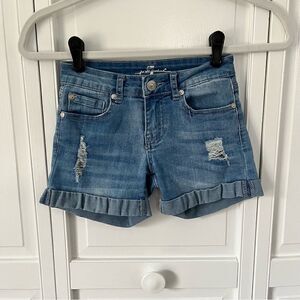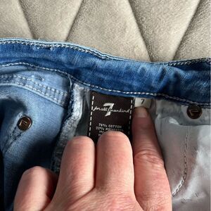 tags: girls 7 jean short quality fashion brand 7 for all man kind distressed destroyed jean shorts denim shorts soft denim cuffed shorts preowned preloved second hand short shorts