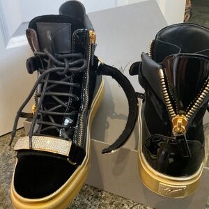 Gorgeous high-top sneakers from Giuseppe Zanotti featuring black velvet effect, panelled design, gold-tone hardware, round toe, front lace-up fastening, front touch-strap fastening, decorative zip detailing, logo patch at the tongue, ankle-length and flat rubber sole.