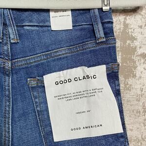 Fantastic jeans from Good American! Features high rise waist, zipper fly, skinny leg silhouette named 'Good Classic', distress details on the front of the legs, full length inseam, and medium blue wash named 'Indigo207'.