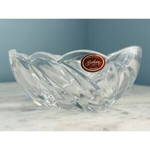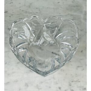 Great condition. No chips or cracks. This is a vintage Gorham heart-shaped fine crystal bowl from Germany. The bowl features a heart pattern and shape, with a clear glass material. It includes a sticker backstamp and weighs 2 pounds. The item stands 3 inches tall and is 6.5 inches wide. This bowl is designed for all occasions and could be used as a candy dish or trinket holder.