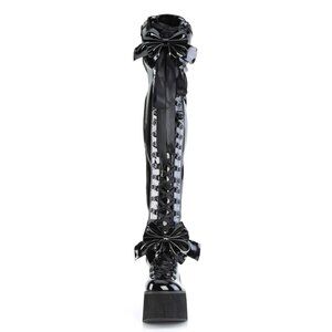 Gothic 4 1/2" Wedge Platform Lace Up Thigh High Boots. Adjustable Straps and Removable Oversized Bow. Full-Length Inner Side Zipper Closure. Black Stretch Faux Patent Leather.