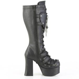 4 1/2" Block Heel, 2" Platform Goth Lace Up Front Knee High Boots. Metal Skull with Hanging Chain Details on Skull Buckled Shield. Skull Double Buckle Straps with Hanging O-Ring Connecting at Center. Inside Metal Zipper Closure. Faux Leather.