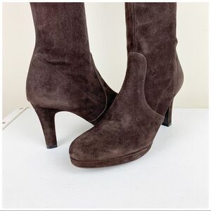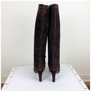 Graffiti Women’s Brown Suede Heeled Platform Boots w/Suede Wrapped High Heel Sz 37.5. Good used condition, with minimal wear to sole and some scuffs on the suede as shown. 14” shaft 3.25” heel 11” circumference at top. Made in Italy. Would be cute with some retro or boho peasant skirts. Or a mini with a sweater! Please see photos for additional details.