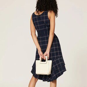 Blue plaid (56% viscose 40% nylon 2% polyester 2% elastane). Hourglass. Sleeveless. Scoop neckline. Invisible back zipper. Hook-and-eye closure. Partially lined. Side pockets. 39" from shoulder to hemline. imported.