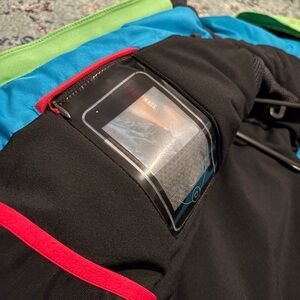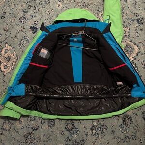 Vibrant green DESCENTE jacket with a hood. Features multiple zippered pockets and stylish blue accents.
