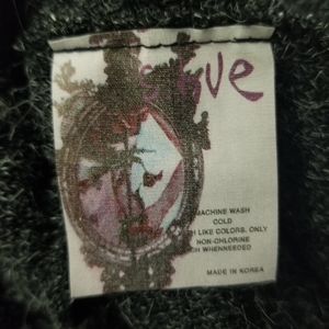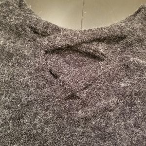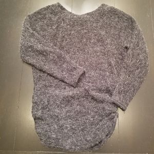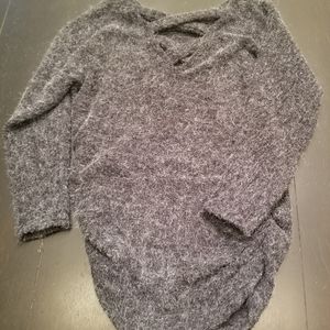 This is a grey sweater with ruching at hips and cute crisscross detail at back, top of neck. Tag doesn't say size but I think it is a medium. Fits me like model and I am a size 4. Never wore this so is new/excellent condition.
