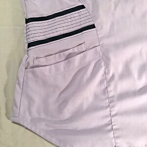 Grey's Anatomy by Barco, Moto Scrubs. Women's size Small, Lavender with Black detail, Short Sleeve Top. 3 Pocket, shaped V-Neck, Moto inspired Pintucks, front and back fitted Princess Seams, Polyester and Spandex. GIT033 Scrubs for Nurse, Vet, Dental, Medical.
