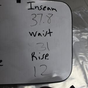 Tag size: 32 (measured waist approx 31 in, inseam approx 37.8 in, rise approx 12 in as written on board)