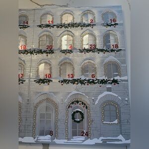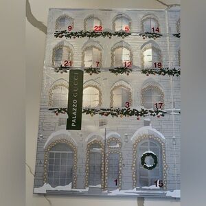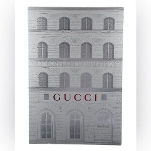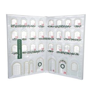 Silver-tone Gucci holiday advent calendar with book form, various shapes of ornaments and brand signature at surface.