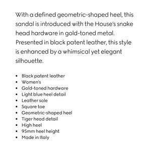Authentic Gucci Dora Two-Toned Embellished Wedge Sandals. Crafted from smooth and patent leather, featuring gold-tone crystal embellishments, tiger head detail, square toe, and sculptural two-tone wedge heel with light blue accent. Adjustable buckle strap ensures a perfect fit. Italian-made luxury design ideal for elevating any outfit.